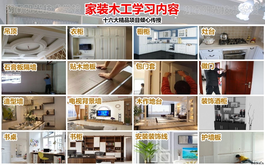 9,重點學習:吊頂、衣柜、櫥柜、灶臺、石膏板隔墻、貼木地板、門頭、門套(括做門)、窗簾盒制作安裝、造型墻、電視裝飾背景制作、木作地臺、裝飾酒柜、書桌、書柜、安裝木質裝飾線、護墻板等十六種家裝木工技術。